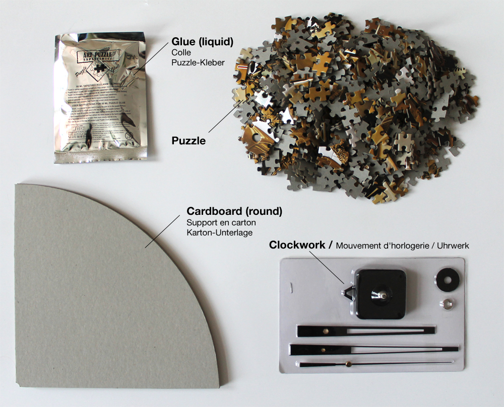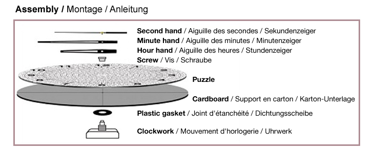 Lieferumfang - Puzzle mit 570 Teilen, rund (Ø 46 cm) - 1 Päckchen Puzzle-Kleber von Art-Puzzle (flüssig) - 1 Pappkarton-Unterlage (4-lagig, rund) - 1 Uhrwerk (inkl. Stunden-, Minuten- und Sekundenzeiger aus schwarzem Metall) Vorrichtung für Aufhängung am Uhrwerk Batteriebetrieb mit 1x AA-Batterie (nicht im Lieferumfang enthalten) ************************************************ Gebrauchsanweisung Ihr Puzzle ist fertig zusammengesetzt und bereit zum Fixieren? Fixieren des Puzzles – so geht's: Nachdem Sie Ihr Puzzle fertig gestellt haben, beginnen Sie zunächst damit, Ihr Puzzle zu fixieren. Legen Sie Ihr Puzzle dafür auf eine Unterlage (z. B. eine Zeitung), um Ihre Arbeitsfläche vor Verunreinigungen zu schützen. Verteilen Sie nun den Inhalt eines halben Leimpäckchens in kleinen Portionen auf dem Puzzlemotiv. Benutzen Sie dazu einen Pinsel oder einen kleinen Schwamm, um den Kleber gleichmäßig in alle Zwischenräume zu verteilen. Lassen Sie das Puzzle nach dem Versiegeln mindestens 60 Minuten ruhen, damit der Kleber sich mit dem Puzzle verbinden kann. Verteilen Sie nach dem Trocknen den restlichen Kleber auf dem runden Pappkarton und fixieren Sie so das runde Puzzle auf der Unterlage. Es empfiehlt sich, den Verbindungsvorgang von Puzzle und Karton zu verstärken, indem Sie das Puzzle mit einem großen Buch oder einem anderen schweren Gegenstand beschweren. Zusammenbau der Puzzle-Uhr – so geht's: Nachdem nun auch Ihr Puzzle und die runde Pappkarton-Unterlage fest aneinander haften, können Sie die Puzzle-Uhr zusammenbauen. Entfernen Sie zunächst die Schutzfolien von den drei Metallzeigern. Legen Sie nun einfach das Uhrwerk zusammen mit der gummierten, schwarzen Dichtungsscheibe unter das Puzzle und montieren Sie auf der Puzzle-Vorderseite durch das Loch hindurch zuerst die kleine Schraube mit Gewinde, den kurzen Stundenzeiger, den Minutenzeiger und abschließend den Sekundenzeiger. Das Uhrwerk kann mit einer gewöhnlichen AA Batterie (1,5 Volt) in Betrieb genommen werden. ************************************************ Achtung: Bitte bewahren Sie Ihre Puzzle-Schachtel solange auf, bis Sie das Puzzle fertig gestellt haben. Jedes Puzzle wird mit größter Sorgfalt produziert und verschickt. Sollte Ihnen doch mal ein Puzzleteil fehlen, so nutzen Sie bitte den Puzzleteil-fehlt-Service von Art-Puzzle! ************************************************